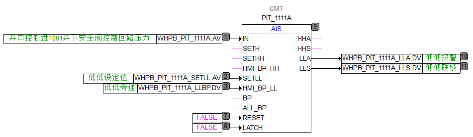 - 功能块左侧依次为“模拟量输入”、“高联锁值设定”、“高高联锁值设定”、“低低联锁值设定”、“旁通”和“保持”