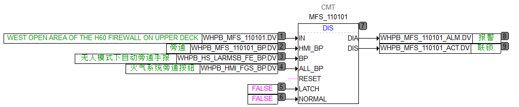 - 功能块左侧依次为“指令输入”、“旁通”、“复位”、“保持”和“正常值写入”