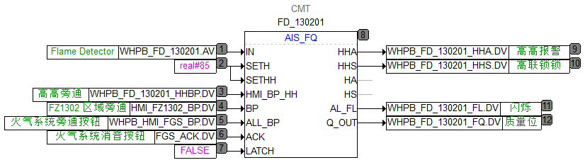 - 功能块右侧依次为“高高报警&联锁”、“高报警&联锁”、“闪烁”和“质量报警”