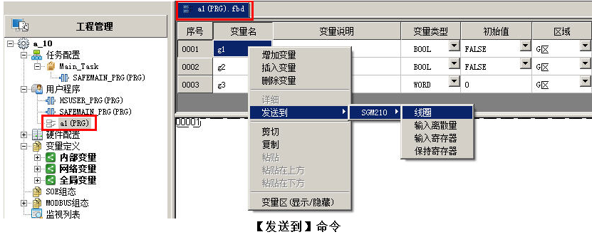 - 以SGM210为例,双击打开【MODBUS组态】的子节点,右键【增加变量】,填入相关信息。