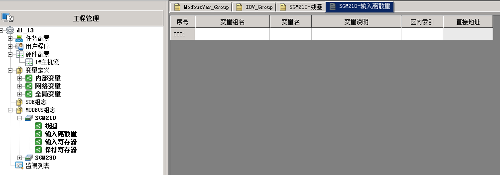 - 对于支持Modbus功能的模块(SGM210、SGM230),完成硬件配置后,可以在【工程管理】-【Modbus组态】下双击打开变量组,进行变量组态。支持映射变量和自定义变量两种方式。